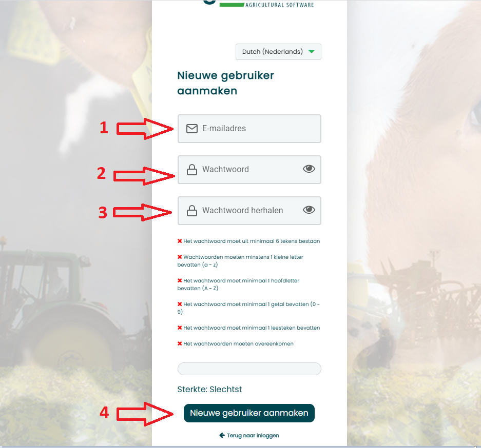 3. Er wordt gevraagd om uw mailadres (1) een wachtwoord te bedenken (2), het wachtwoord te herhalen (3). Bevestig de nieuwe gebruikersnaam en wachtwoord door te kiezen voor [Nieuwe gebruiker aanmaken] (4).